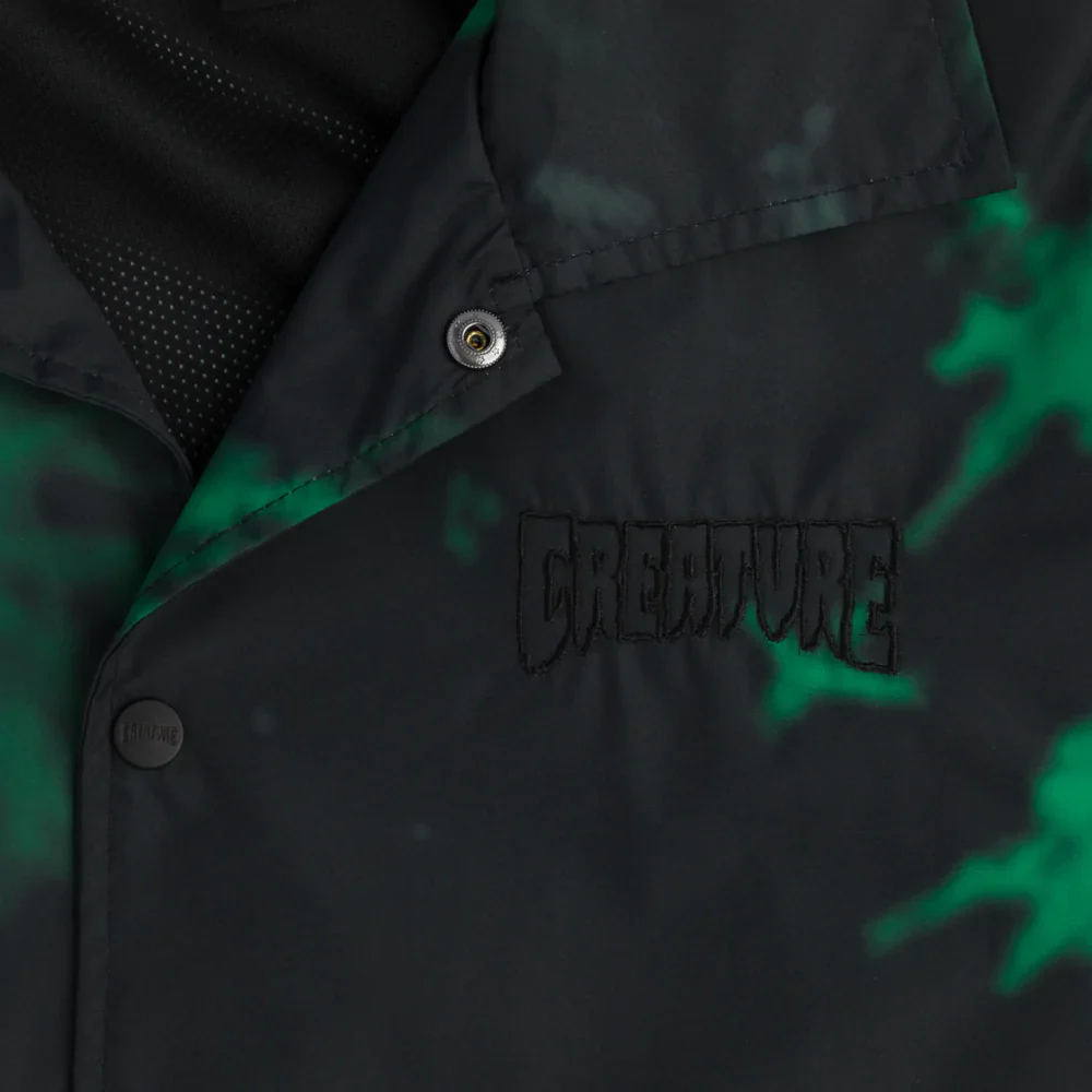 The Creature Void custom regular fit coach windbreaker jacket features sublimated all over print, mesh lining, welt pockets, snaps and Creature embroidery at chest