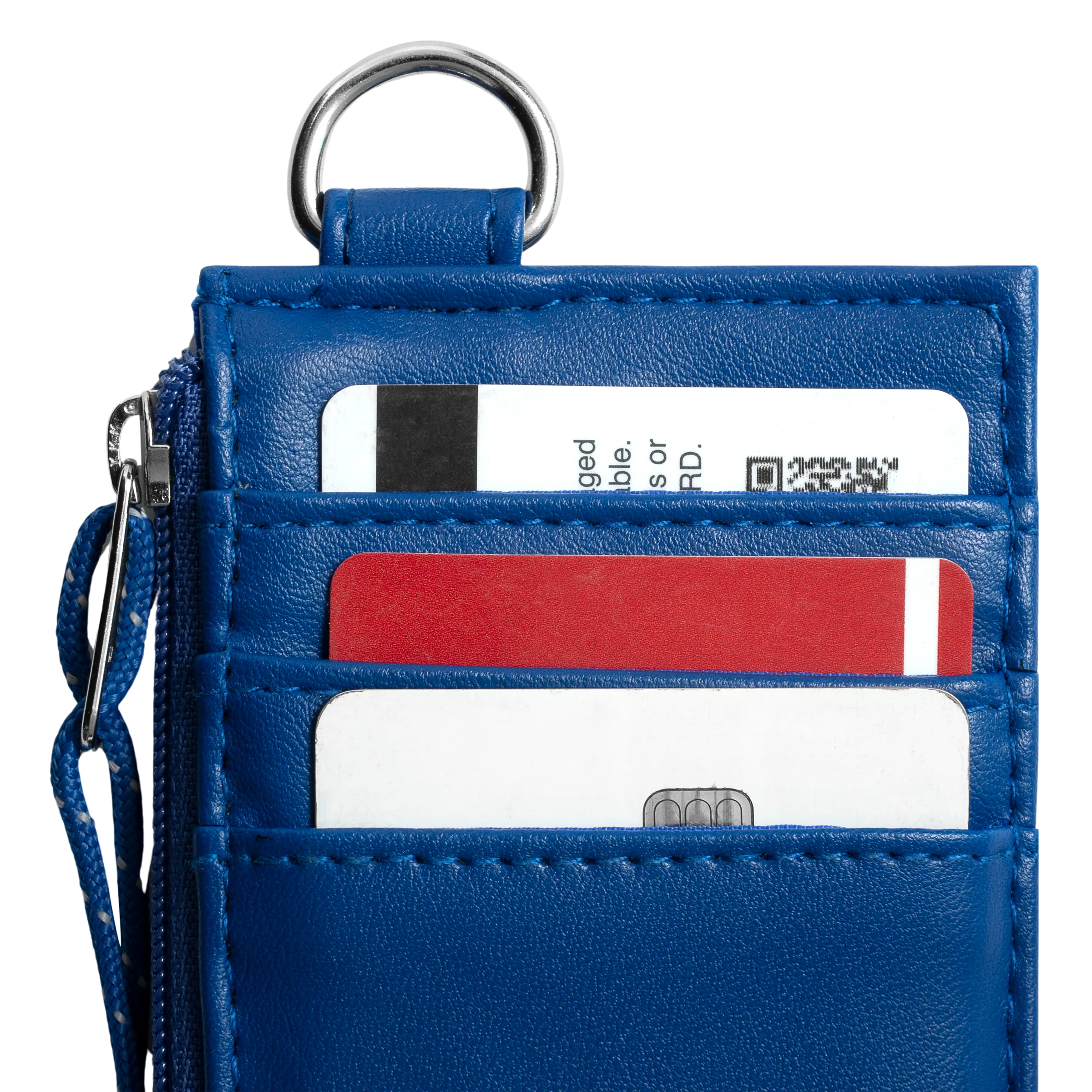 Premium synthetic leather cardholder with a raised & textured printed logo on exterior. 3 exterior card holder slots, large zip pocket & metal d-ring
